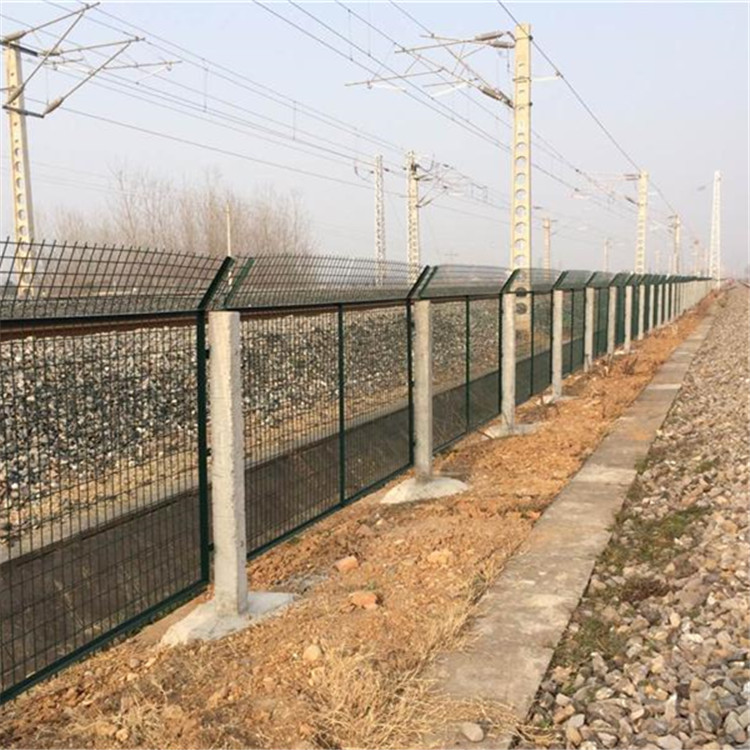 鐵路防護柵欄又叫鐵路隔離柵、鐵路防護網,鐵路防護柵欄是金屬網片防護柵欄的樣式之一,鐵路橋下防護柵欄是指高鐵橋下的隔離防護柵欄。主要作用橋墩安全,防止行人、車輛穿越,保障橋墩安全的作用,防護柵欄的結構是由金屬網片、鋼筋混凝土立柱組成。
