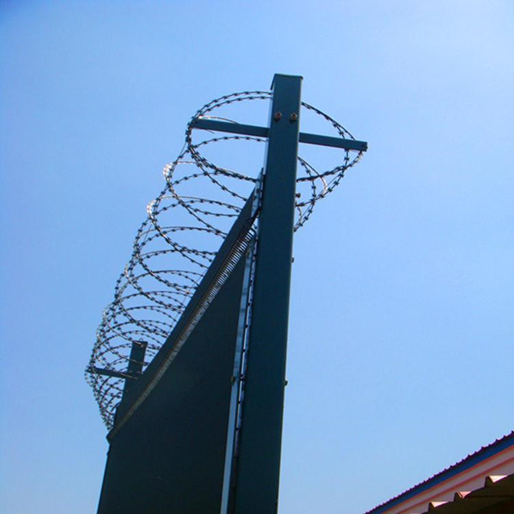 V型托架刀刺網拉絲采用貫穿式連接,每隔20m固定拉絲,立柱做調直處理,每20m校正,每100米偏差角度不大于5°,安裝整體無歪斜,鋼網墻整體呈直線除地形需要做出適宜角度外。